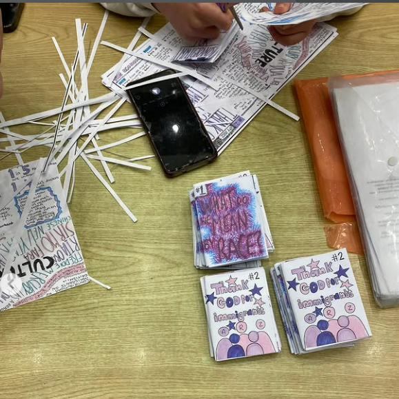 We use zines, because they are simple, inriguing and accessible to all. We also wanted to target this campaign more specifically at young people and thought zines were a powerful and creative medium. They are also physical, so distributing them in the public we believe helps to build a greater resistance to institutional racism and create solidarity through visual art.